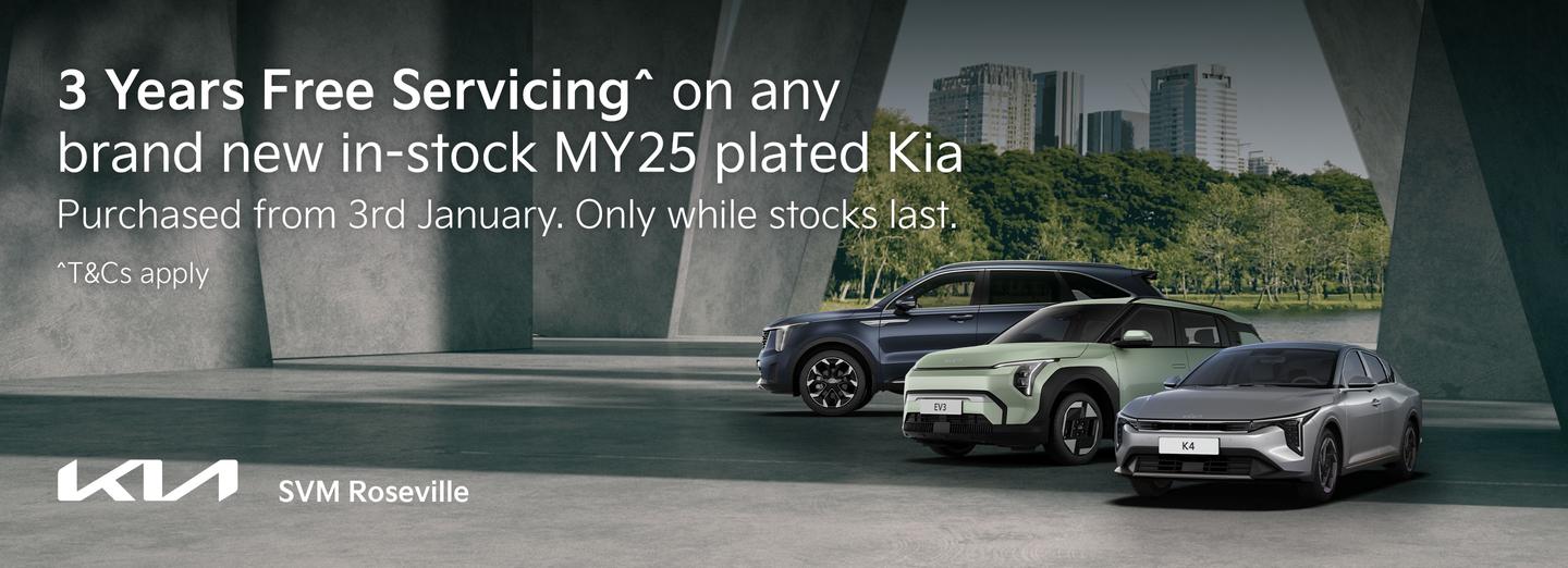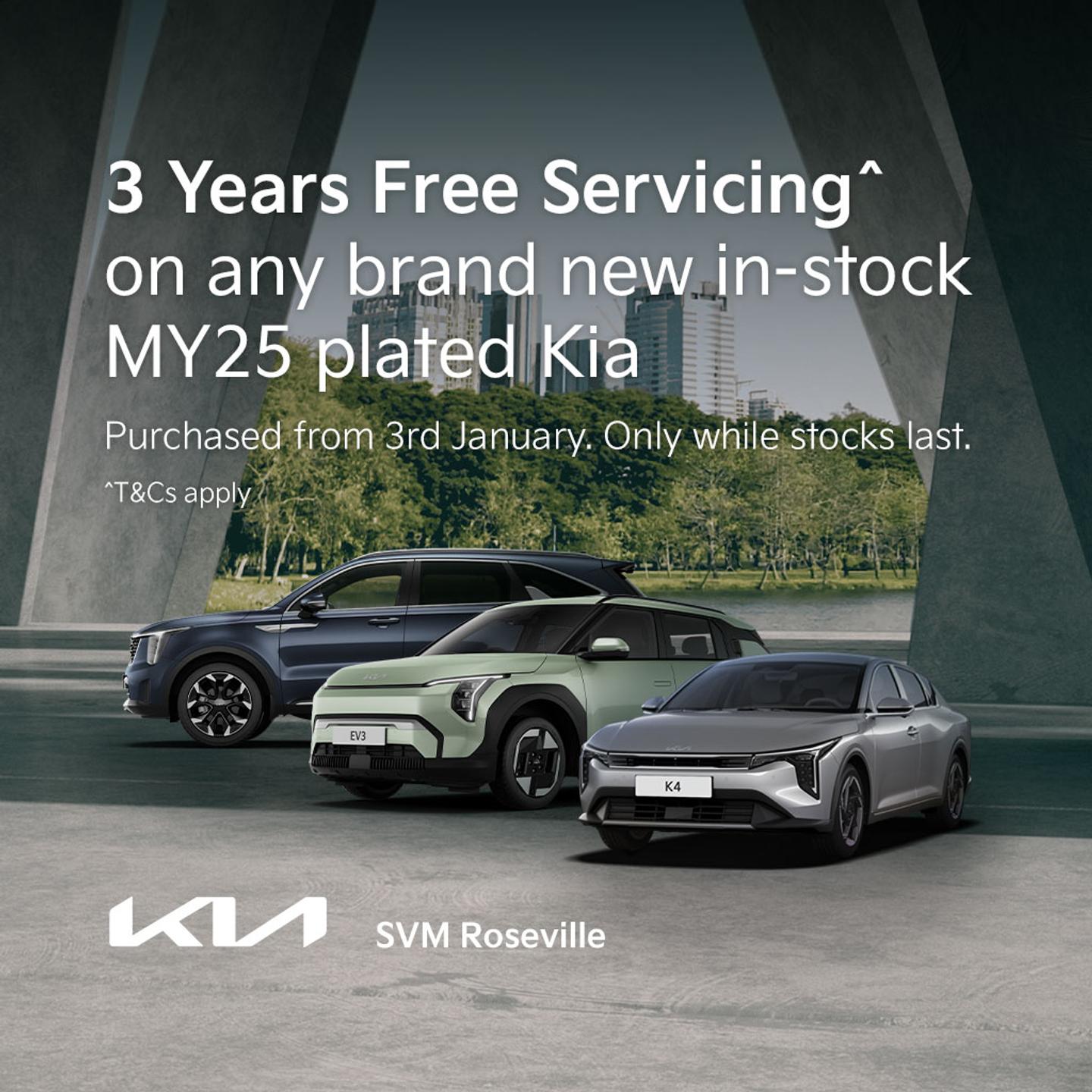 ^Purchase any in-stock MY25 plated brand-new Kia vehicle from SVM Kia Roseville from 3 January 2026 and receive three (3) years free scheduled servicing for the purchased vehicle. This offer is only valid while stocks last. This offer includes the first three scheduled logbook services, based on time or distance (whichever occurs first), in accordance with Kia’s recommended maintenance schedule. Services must be redeemed exclusively at SVM Kia Service (Artarmon). Any additional work outside of scheduled servicing will incur extra charges. The free service offer will be applied and noted on the contract of sale. This offer is only applicable to in-stock brand-new MY25 plated Kia vehicles at SVM Kia Roseville. Offer is non-transferable, not redeemable for cash, and cannot be combined with any other offer or promotion. Excludes demonstrator vehicles, pre-owned vehicles, fleet, government, rental, rideshare, and national fleet customers. SVM Kia Roseville reserves the right to change, supersede, or extend this offer at any time without notice.