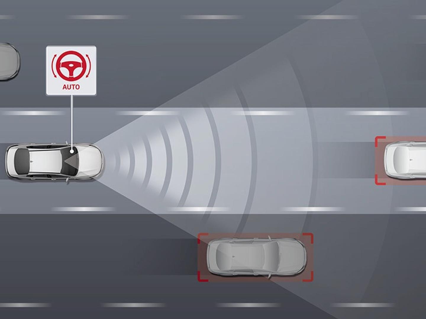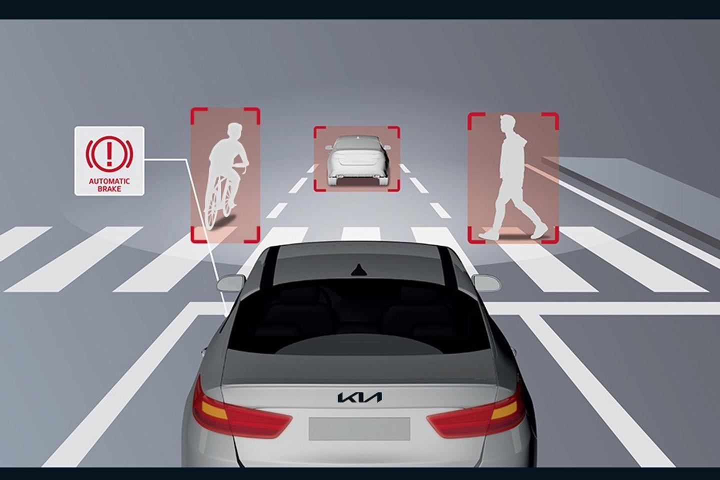 Using radar and camera data, the AEB system senses the potential for a collision with a pedestrian, car or cyclist ahead, and applies emergency braking to avoid or reduce the effects of a collision.