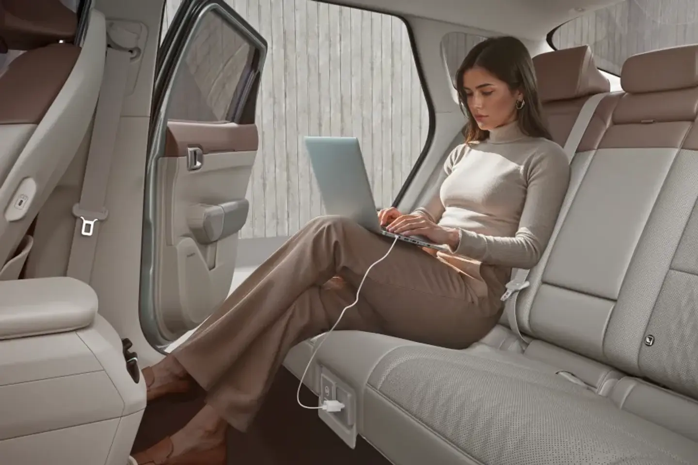 Interior V2L (Vehicle-to-load) outlet in the rear is equipped with a standard power socket to power various devices without needing an adaptor.