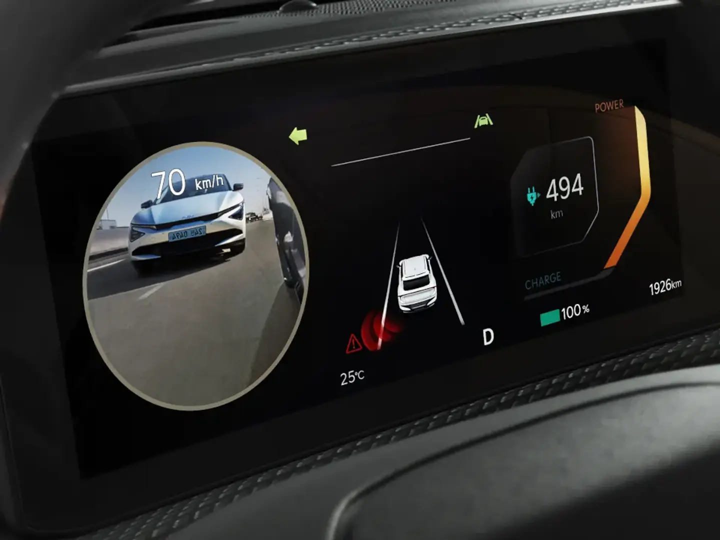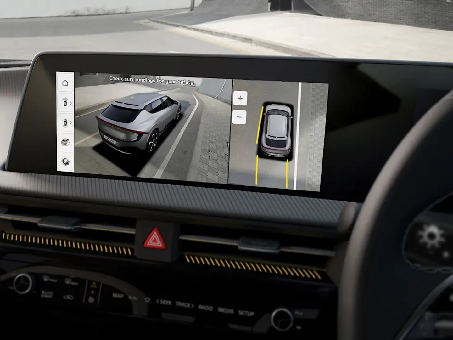 By activating the turn signal, the wide-angle side mirror mounted cameras will display live footage of your blind spots on the instrument cluster.
