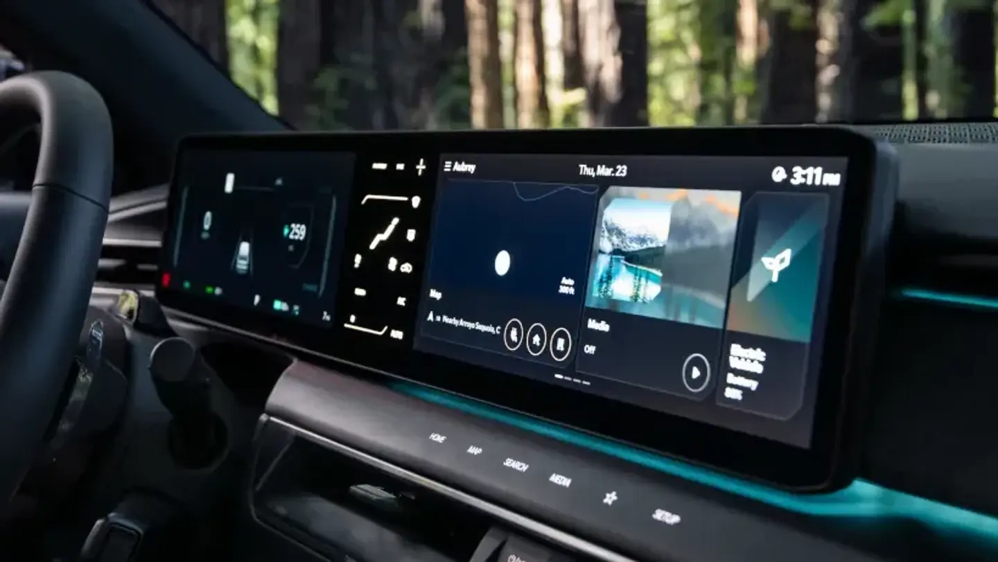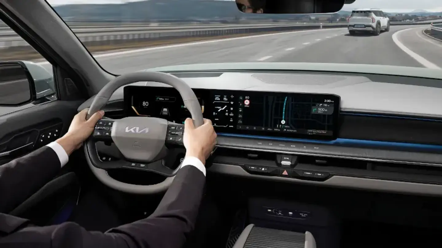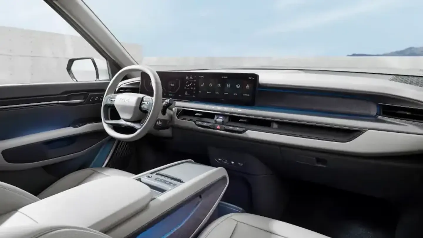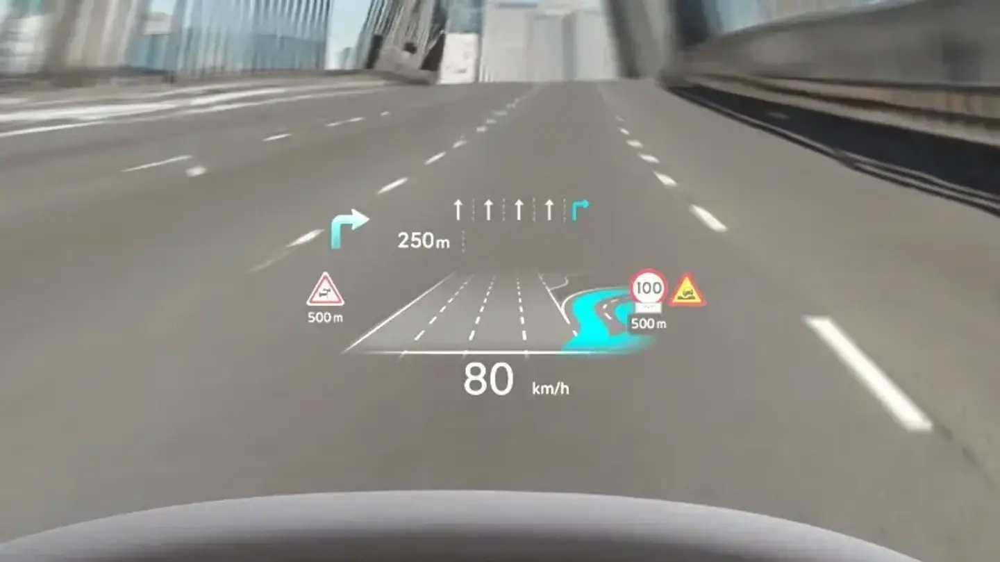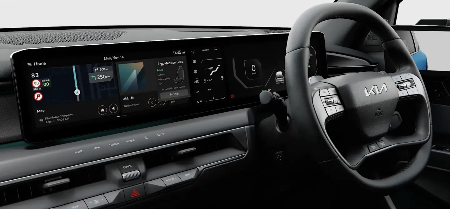 The EV9's augmented reality HUD projects key information on your windscreen such as speed, navigation guidance and lane safety information.