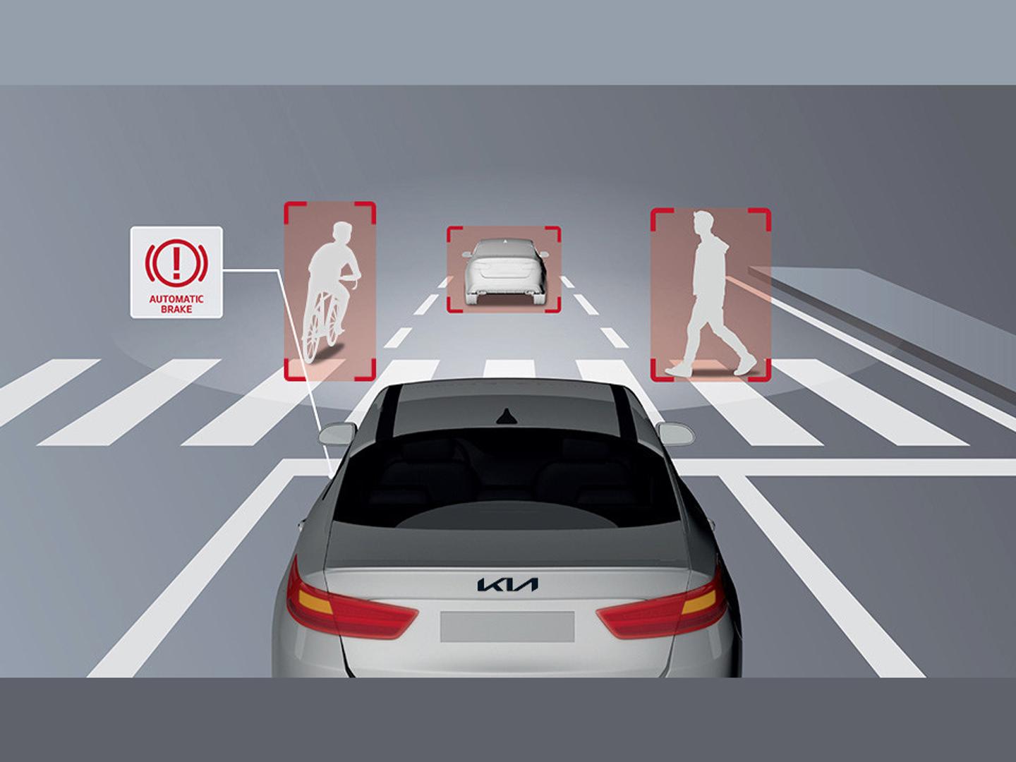 Using radar and camera data, the AEB system senses the potential for a collision with a pedestrian, car or cyclist ahead, and applies emergency braking to avoid or reduce the effects of a collision.